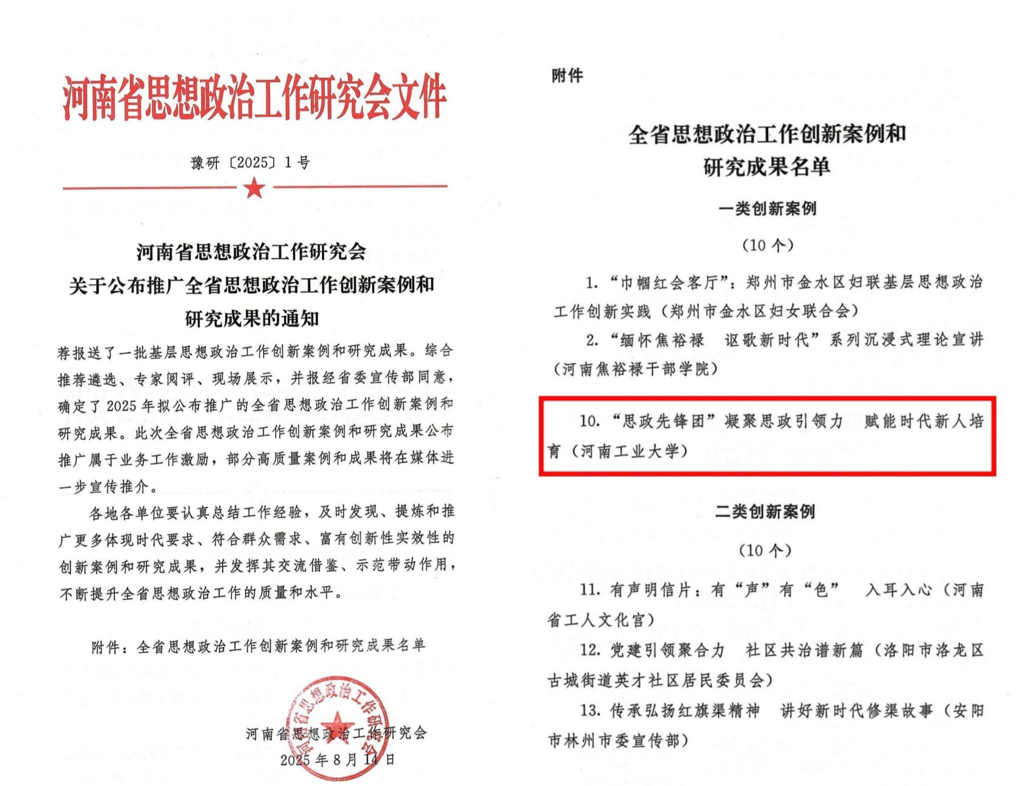 河南工业大学“思政先锋团”获评2025年全省思想政治工作一类创新案例