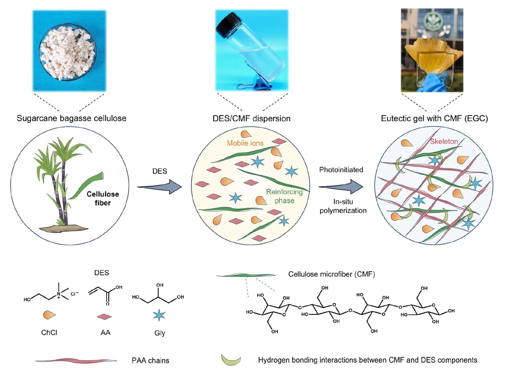 对柔性电子产品日益浓厚的兴趣正持续推动深共晶凝胶的开发,这类凝胶因兼具力学适应性、电学功能与环境可持续性而备受关注;然而,如何同时实现这些性能仍是一项重要挑战。为此,本论文提出一种基于甘蔗渣纤维增强的生态设计深共晶凝胶系统,该系统以三组分深共晶溶剂(DES)——氯化胆碱/丙烯酸/甘油(ChCl/AA/Gly)为基础,该DES同时作为纤维处理介质和聚合物前体。借助丙烯酸的酸性以及DES体系内强大的氢键网络,未经预处理的甘蔗渣纤维可直接水解为微米级纤维并均匀分散,从而避免了传统苛刻的预处理步骤。在凝胶内部,氯化胆碱提供可迁移离子,丙烯酸构成刚性骨架,甘油增强柔韧性与离子迁移率,而纤维则通过强氢键强化基质。所得凝胶表现出优异的综合性能:拉伸强度显著提升、附着力广泛、离子电导率良好(室温下达12.7 mS/cm)以及出色的耐低温性能(低至-50°C)。这些特性使其能适用于多种应用场景,例如可作为柔性应变传感器和超级电容器电解质,其介电常数高达10.17,并在20000次循环后仍保持稳定的耐久性。本研究提出了一种简便的纤维素增强多组分共晶凝胶构建策略,为开发先进的柔性电子材料提供了一条可持续的路径。